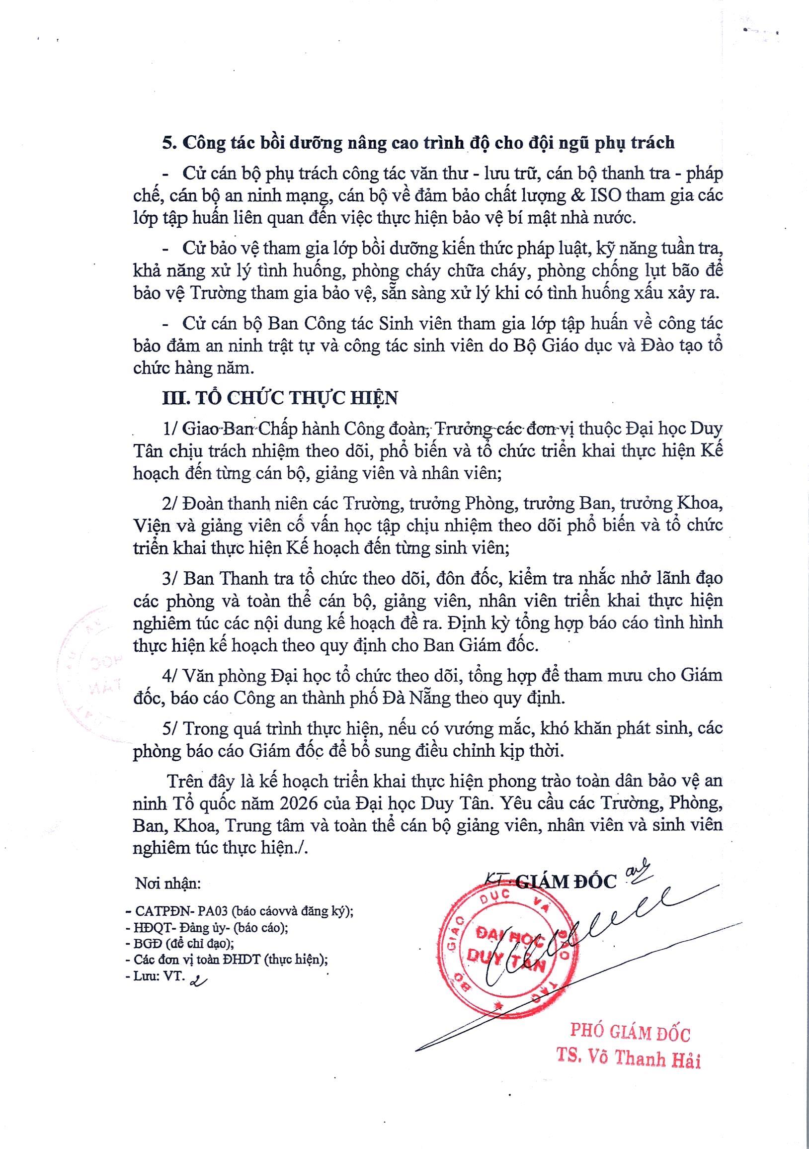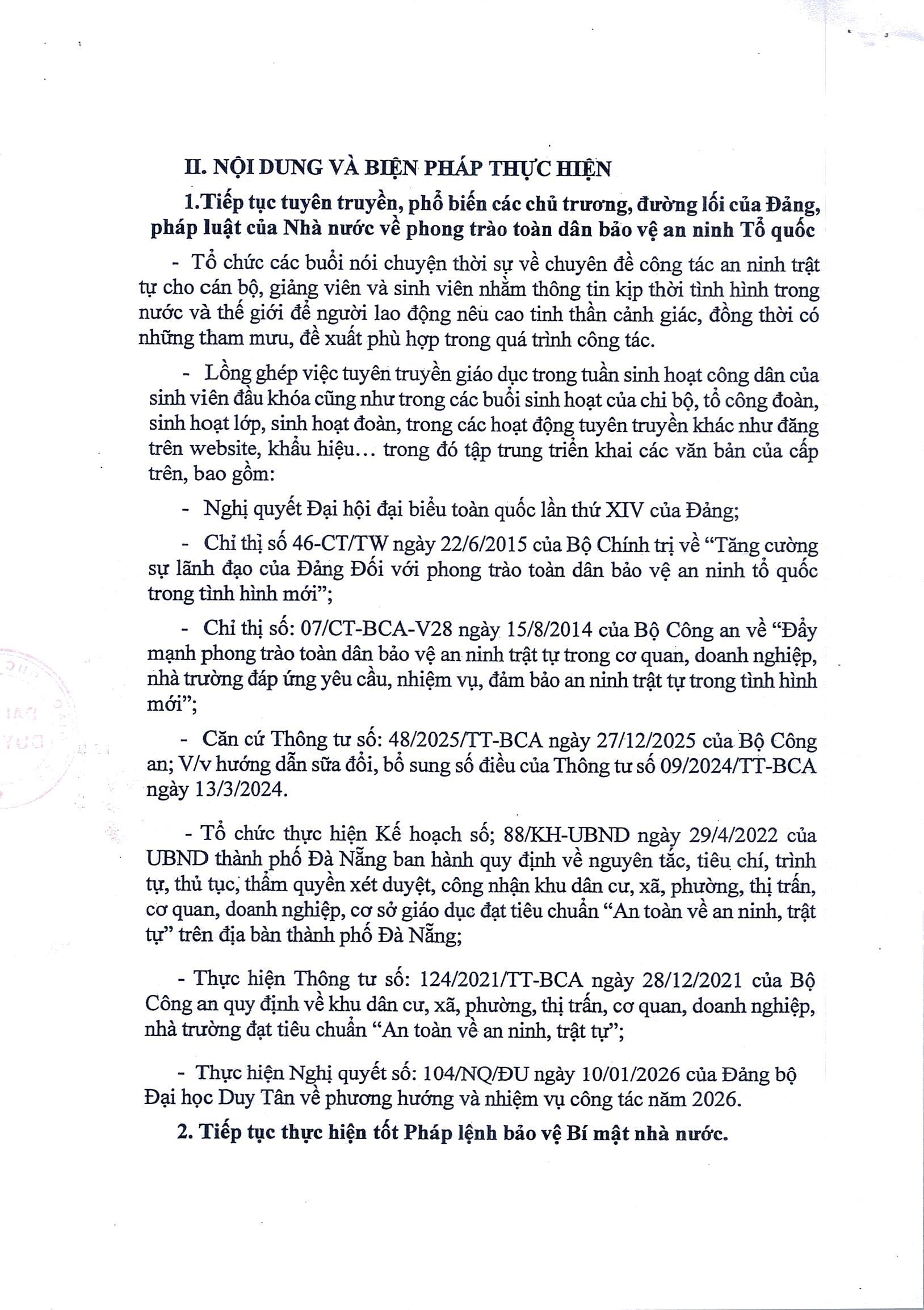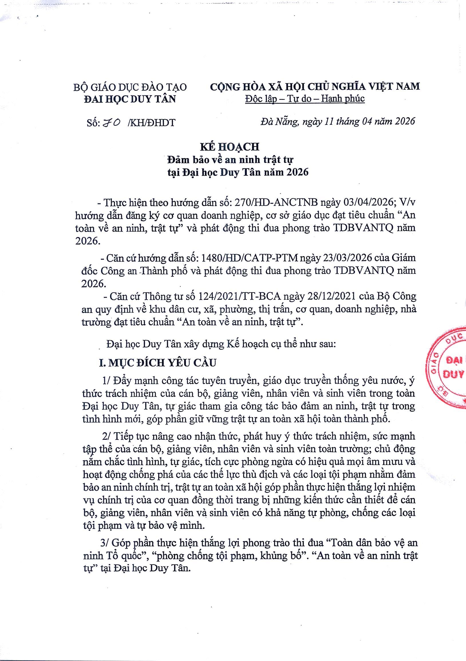 KẾ HOẠCH ĐẢM BẢO AN NINH TRẬT TỰ TẠI ĐẠI HỌC DUY TÂN NĂM 2026